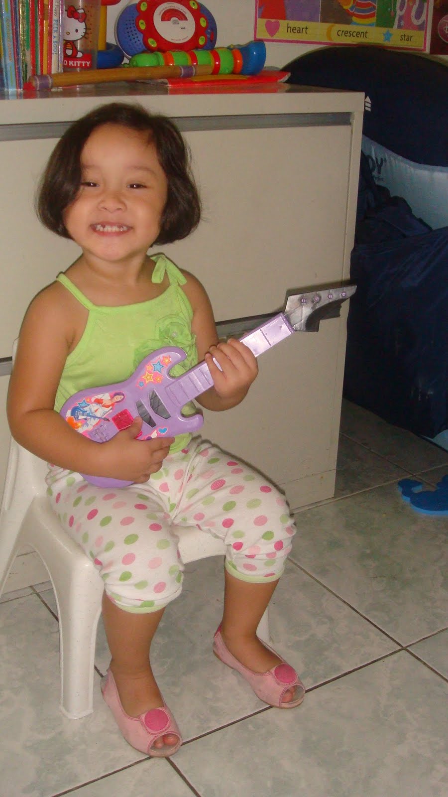 At this early age of 2, we can already see Kelsea’s love for music. She loves to sing nursery rhymes, Barney and Hi-5 songs and with actions. She also gets excited when she receives musical instruments as gifts. Among the toy musical instruments she has, the guitar is what she plays with most. Maybe that’s because she sees her dad playing his electric guitar.