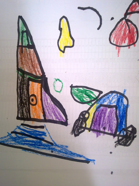 Can you guess what she has drawn? It’s her best friend Erin’s 3-storey house (with one window) daw on the left. Their car (with a green side mirror) on the right. The lines colored in blue in front of the house are the stairs. The yellow irregular shape above is the moon while the red bag are cookies for Erin.