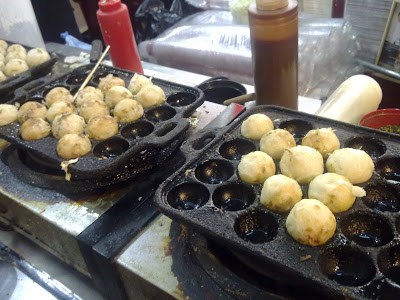 What is a takoyaki? According to Wikipedia, “Takoyaki is a ball-shaped Japanese snack made of a wheat flour-based batter and cooked in a special takoyaki pan. It is typically filled with minced or diced octopus, tempura scraps (tenkasu), pickled ginger, and green onion.Takoyaki are brushed with takoyaki sauce, a sauce similar to Worcestershire sauce, and mayonnaise. The takoyaki is then sprinkled with green laver (aonori) and shavings of dried bonito (katsuobushi).