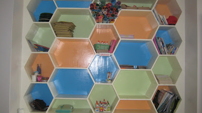 Inside the classrooms were haxagon-shaped open storage areas where the teachers keep the school supplies.