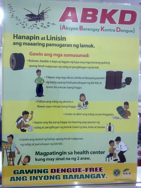 How do we get rid of this bad illness? The commercial products we can buy like insect repellants are not enough because they are not long-term solutions. Actions must start in our own homes. I saw this poster in a hospital to remind the whole community on how to fight dengue.