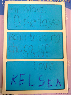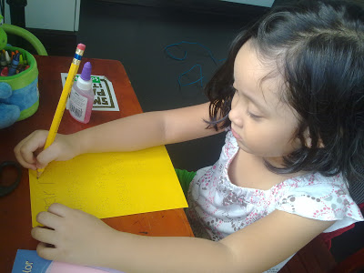 I initially thought of a design and then prepared the cut-outs. The front area of the card will be for the design while the back area will have Kelsea’s birthday message to the kid. I asked her first what she wanted to tell each particular kid and then I wrote that message using a pencil making the letters broken lines. This would make a great writing activity for Kelsea since she could trace the letters and write the message herself 🙂 Then at the bottom, I let her write her name on her own.